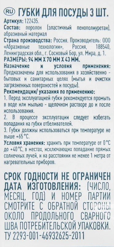 | Комплектация | губка для мытья посуды - 3 шт. |