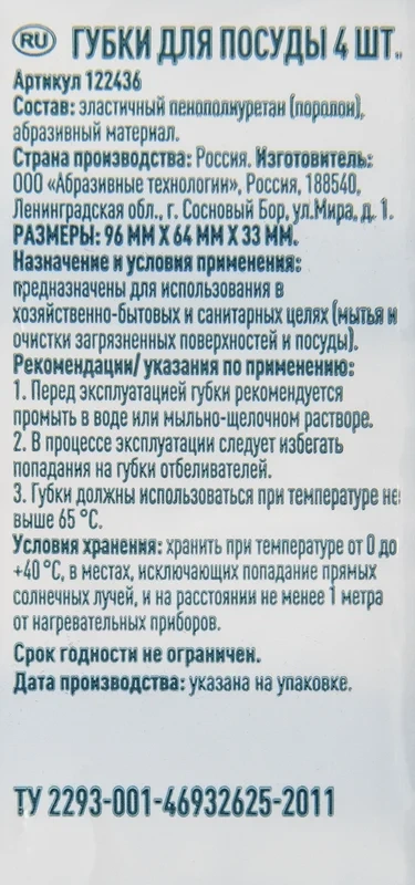 | Комплектация | губка для мытья посуды - 4 шт. |