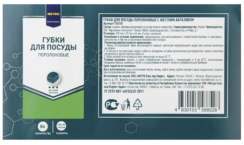 METRO PROFESSIONAL Губка для посуды фрезерованные с жесткой абразивностью, 8 шт. имеет удобную форму, поэтому ее просто удерживать в руке даже в мокром виде и в намыленном состоянии. Она предназначена для использования в хозяйственно-бытовых и санитарных целях, так как способна эффективно очищать загрязненные поверхности и посуду. Губка изготовлена из материала, в который хорошо проникает моющее средство и равномерно распределяется по поверхности, быстро вспениваясь. На ее верхней стороне установлен слой абразивного материала, который способен быстро очищать сильно загрязненные поверхности.