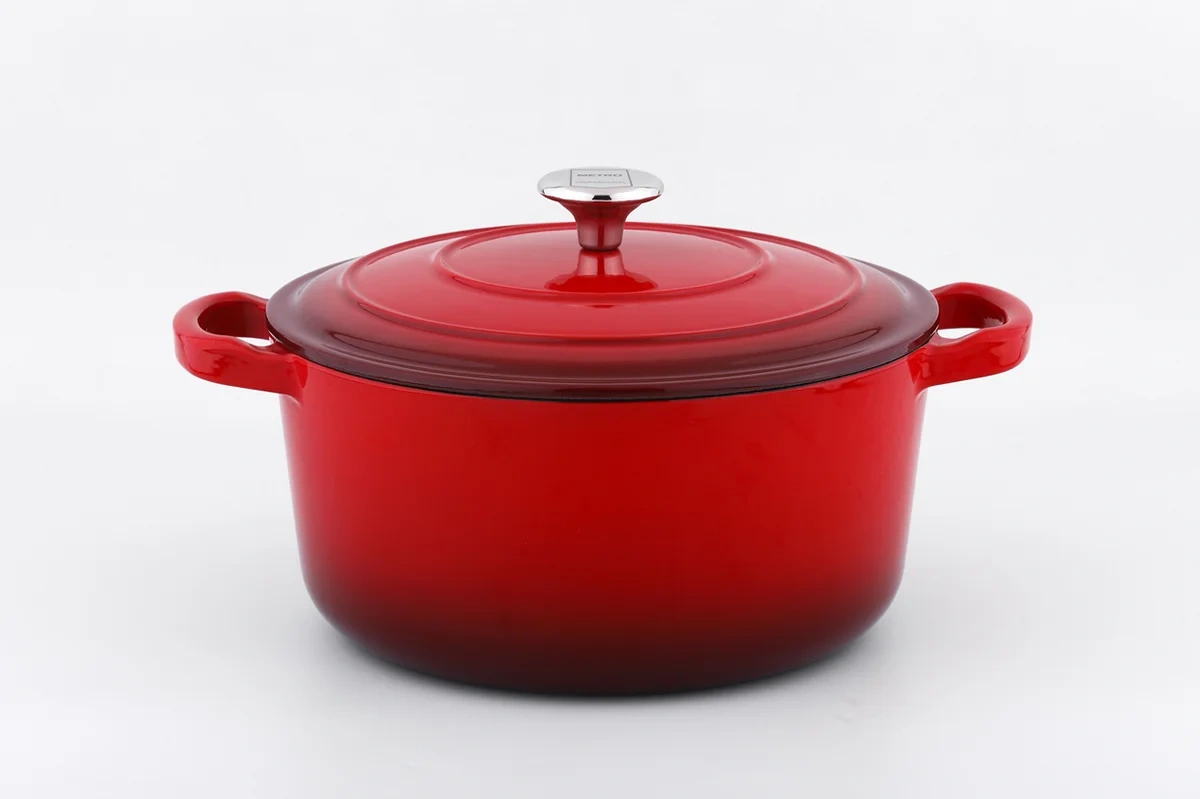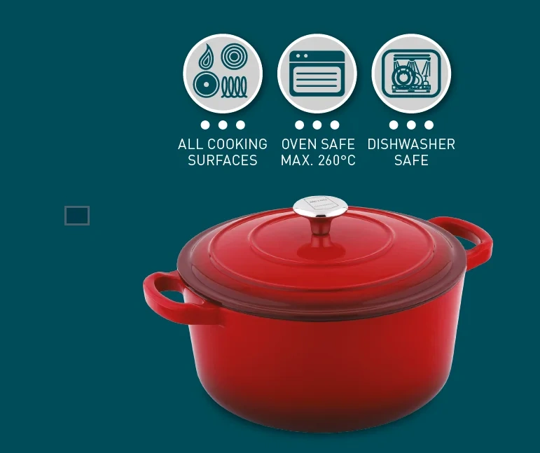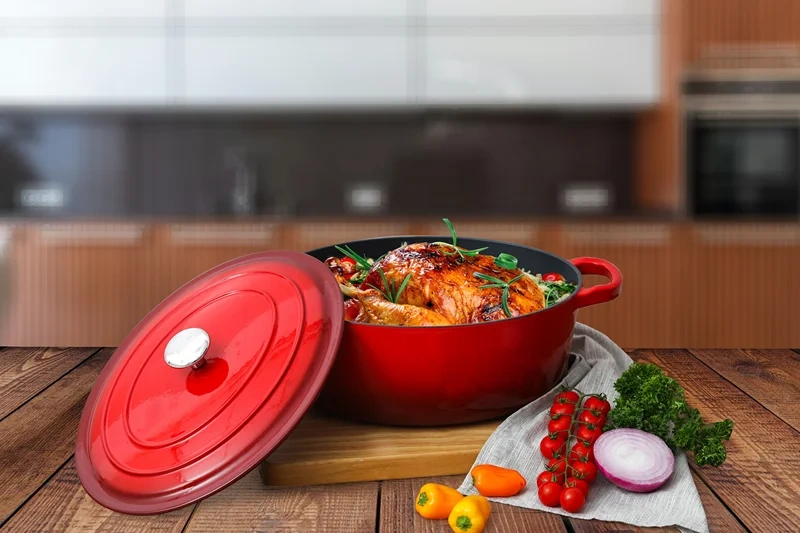 Чугунная кастрюля с крышкой обладает толстыми стенками, благодаря этой особенности в посуде можно тушить и варить на плите или в духовом шкафу. Отлично подойдёт для приготовления жаркого, тушенного кролика, птицы, гуляша или плова. Изделие выполнено из эмалированного чугуна материал обладает низкой теплопроводностью, поэтому медленно нагревается и распределяет тепло равномерно по всей поверхности. Долго остывает, поэтому кастрюлю можно снять с огня, и блюдо ещё долго будет оставаться горячим. Такая посуда станет идеальным выбором для любителей тушеных блюд.