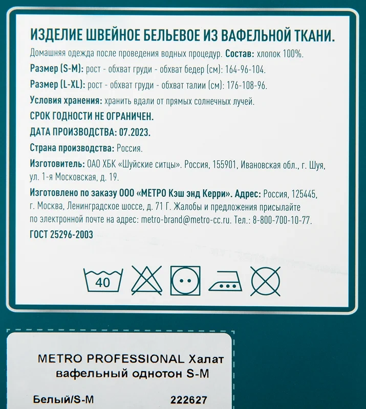 METRO PROFESSIONAL Халат вафельный однотонный белый размер S-M это стильный предмет гардероба, которые отличается высоким качеством и практичностью. Изделие изготовлено из высококачественного вафельного материала, которое приятно к телу и предотвращает перегревание. Ткань обеспечивает отличную воздухопроницаемость и позволяет коже дышать. Это делает халат идеальным для использования после душа, бани или в сауне. Модель отличается элегантным и стильным внешним видом благодаря однотонному дизайну в белом цвете. Выполненная в размере L-XL она подходит как для мужчин, так и для женщин. Специальный пояс помогает регулировать посадку и обеспечивает дополнительную поддержку. Преимуществом вафельного изделия стала способность быстро выс??хать, что позволяет халату мгновенно впитывать влагу и оставаться сухим.