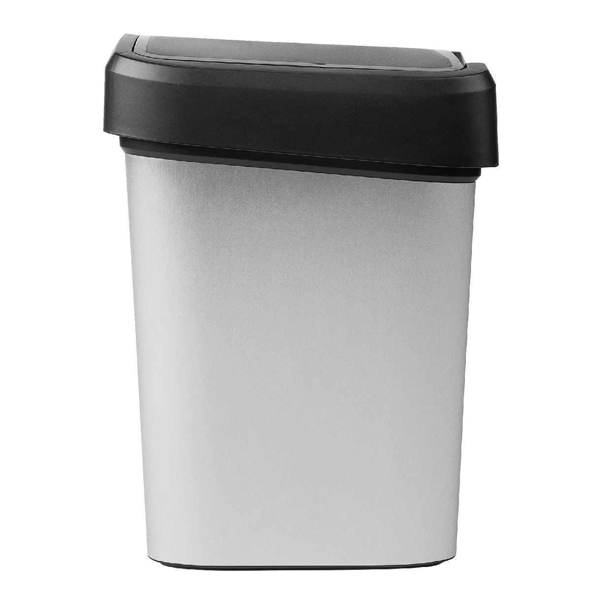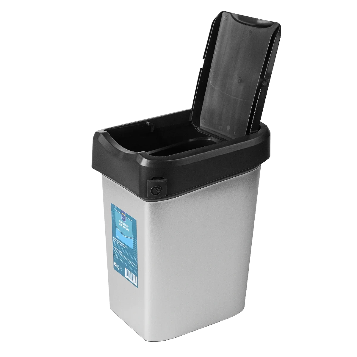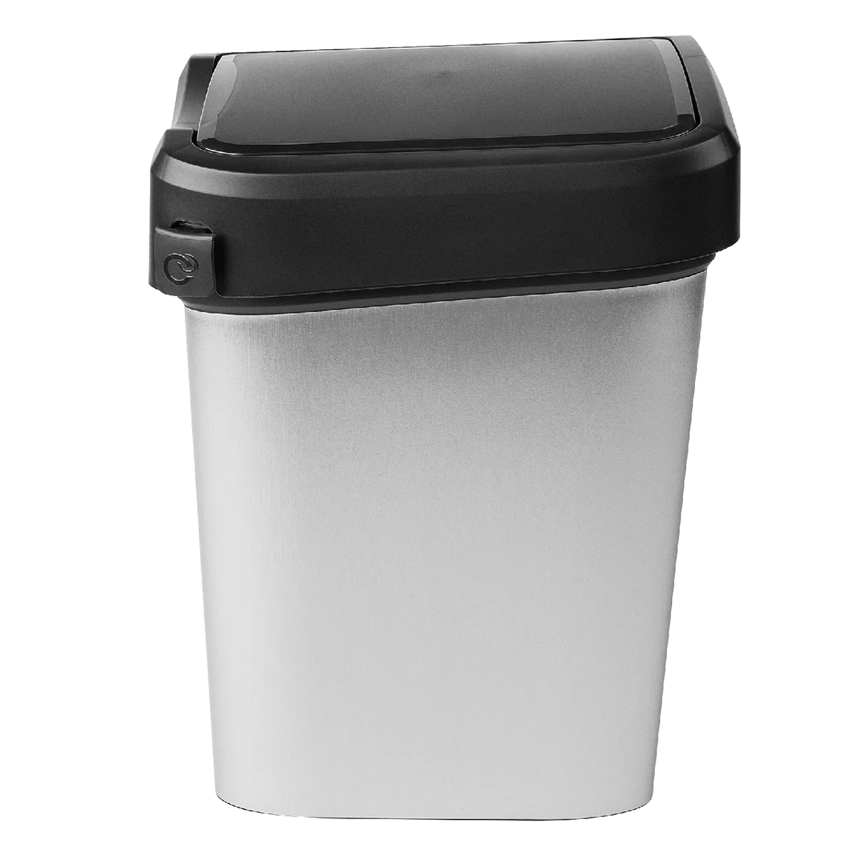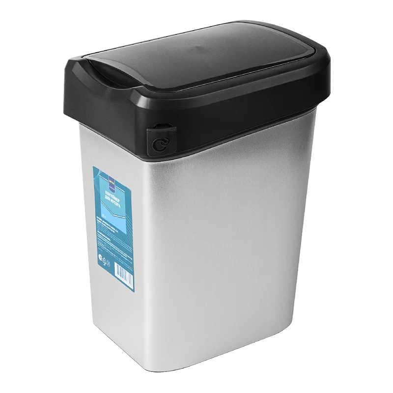 Изготовлен из прочного пластика. Удобная система открывания крышки позволит выбросить мусор в ведро даже с занятыми руками, просто толкнув створку вниз. Крышка может фиксироваться в открытом положении для крупного мусора. Контейнер для раздельного сбора мусора имеет специальное крепление для мусорных пакетов, блокирует неприятные запахи, препятствуя их распространению. Благодаря стильной металлизированной поверхности контейнер гармонично впишется в интерьер кухни, ванной, спальни, офиса и любого другого помещения. Поверхность контейнера легко моется, на ней не остается разводов.