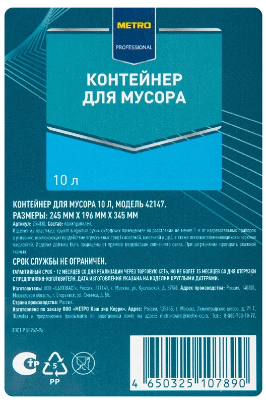 | Комплектация | контейнер для мусора с крышкой - 1 шт. |