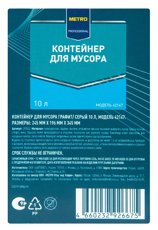 | Комплектация | мусорный бак с крышкой - 1 шт. |