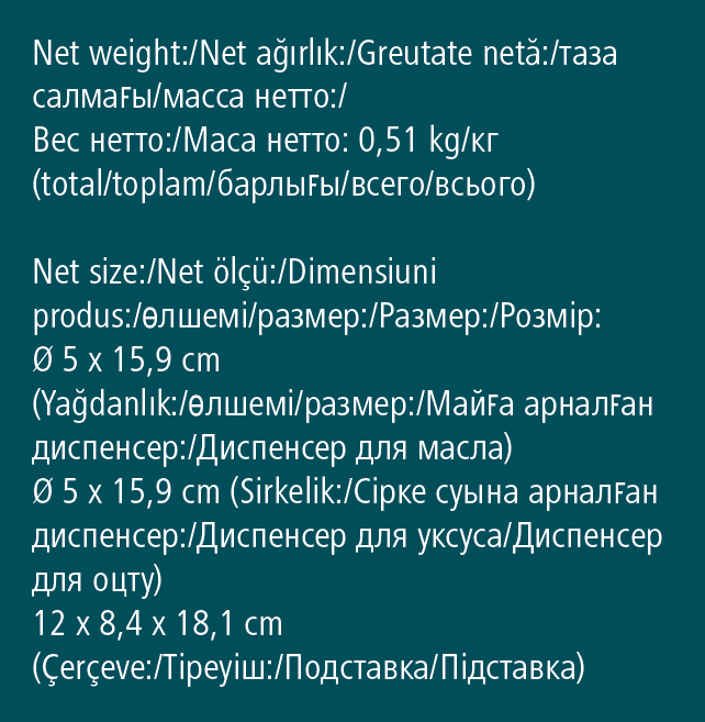 Это универсальный аксессуар, который необходим на любом предприятии общественного питания. Его подают на стол в кафе, барах, ресторанах, столовых, на летних площадках с мангалом или барбекю. Набор можно приобрести для использования в домашних условиях. Набор для специй с лаконичным дизайном будет органично выглядеть на любом столе. Бутылки идеально подойдут для хранения и подачи к столу масла и уксуса. Плотно закрывающаяся крышка дольше сохраняет свойства содержимого и препятствует проливанию. Встроенный дозатор помогает экономично расходовать масло и уксус.