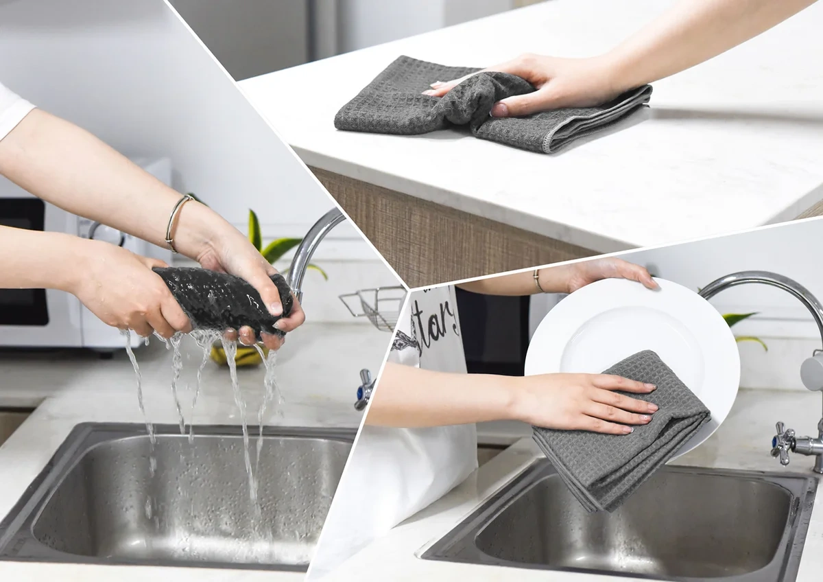 Набор вафельных полотенец для кухни идеально подходит для вытирания посуды, рук и других кухонных нужд. Вафельная ткань, которая обеспечивает хорошую впитываемость и долговечность. Материал легко стирается и быстро сохнет, что делает их удобными в повседневном использовании. Выдерживает множественные стирки с использованием практически любых сильнодействующих средств и даже кипячения.