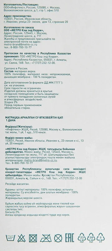 METRO PROFESSIONAL Наматрасник, 160 x 200 см предназначен для защиты вашего матраса от различных повреждений и обильного воздействия влаги. Теперь вы можете наслаждаться комфортом и спокойным сном. Ведь ваш матрас сохранит идеальное состояние на протяжении долгих лет использования. Наматрасник – неотъемлемая часть любой спальни и обязательный элемент постельных принадлежностей. Особенно полезным он будет для тех, у кого есть маленькие дети, которые могут не всегда быть бережными к мебели. Одним из преимуществ является его водонепроницаемость. Это означает, что он будет защищать ваш матрас от проникновения влаги, будь то разлитая жидкость или детская пеленка. Он останется сухим и чистым на протяжении долгого времени. Текстильный аксессуар также отличается неприхотливостью в использовании. Он легко стирается и долго сохраняет свои потрясающие свойства при условии соблюдения рекомендаций по температурному режиму стирки. Наматрасник надежно защитит матрас от потертостей, пятен и других механических повреждений. Изготовлен из высококачественных материалов: верхняя часть состоит на 80% из хлопка и на 20% из полиэстера, нижняя часть — из 100% полиуретана. Это обеспечивает мягкость, прочность и долговечность.