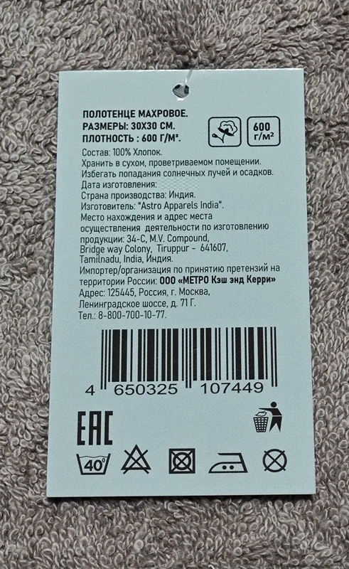 | Комплектация | полотенце - 1 шт. 30х30см |