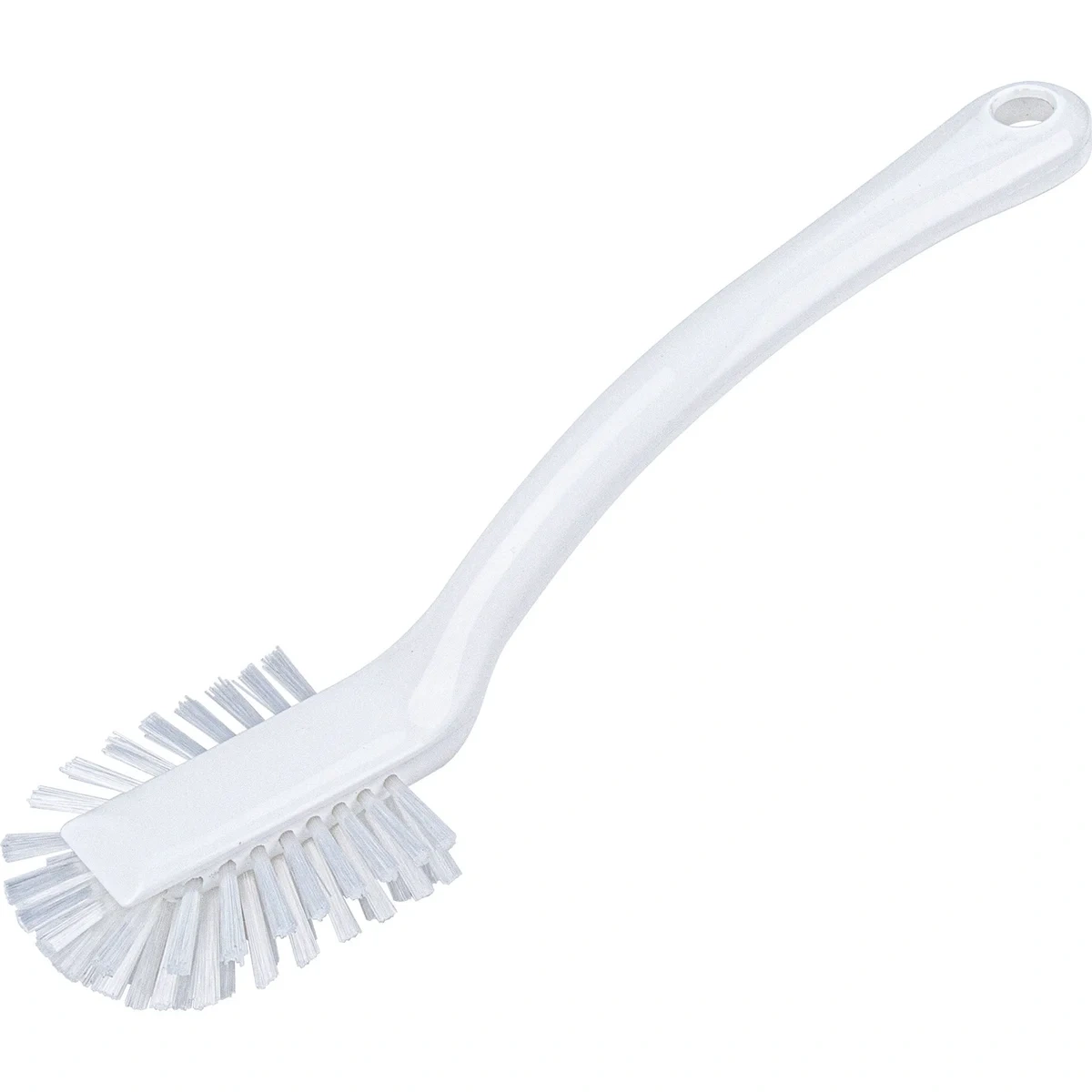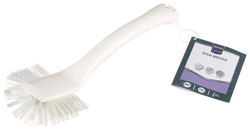 METRO PROFESSIONAL Щетка для посуды белая выполнена из полипропилена и имеет щетину средней жесткости, с помощью которой легко, но деликатно удаляются самые стойкие загрязнения с посуды. Щетка для мытья посуды с пластиковой ручкой имеет удобное отверстие для подвеса.
