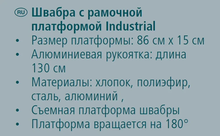 Швабра METRO PROFESSIONAL позволяет выполнить качественную влажную обработку полов в помещениях большой площади. Ее эргономичная ручка и подвижное основание обеспечивают легкое проникновение ?? труднодоступные места. Благодаря компактным размерам инструмент для уборки занимает немного места при хранении. Мягкая хлопковая насадка швабры хорошо очищает полы из плитки, линолеума, полимерных материалов. После уборки ее легко снять и постирать с помощью синтетических моющих средств. Надевать на основание насадку удобно в сухом и влажном виде.