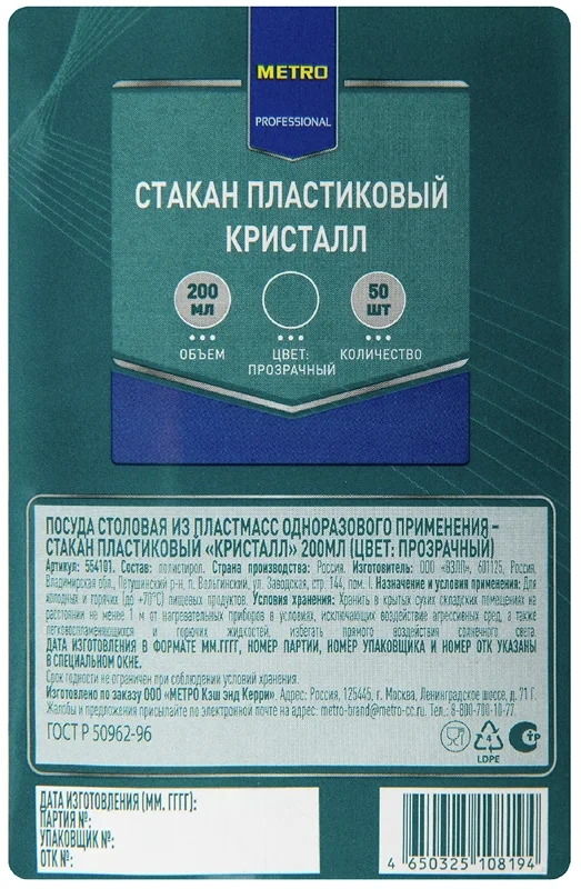 Отзывы о «Стакан одноразовый Metro Professional Кристалл 200мл, цветной, 50шт/уп»