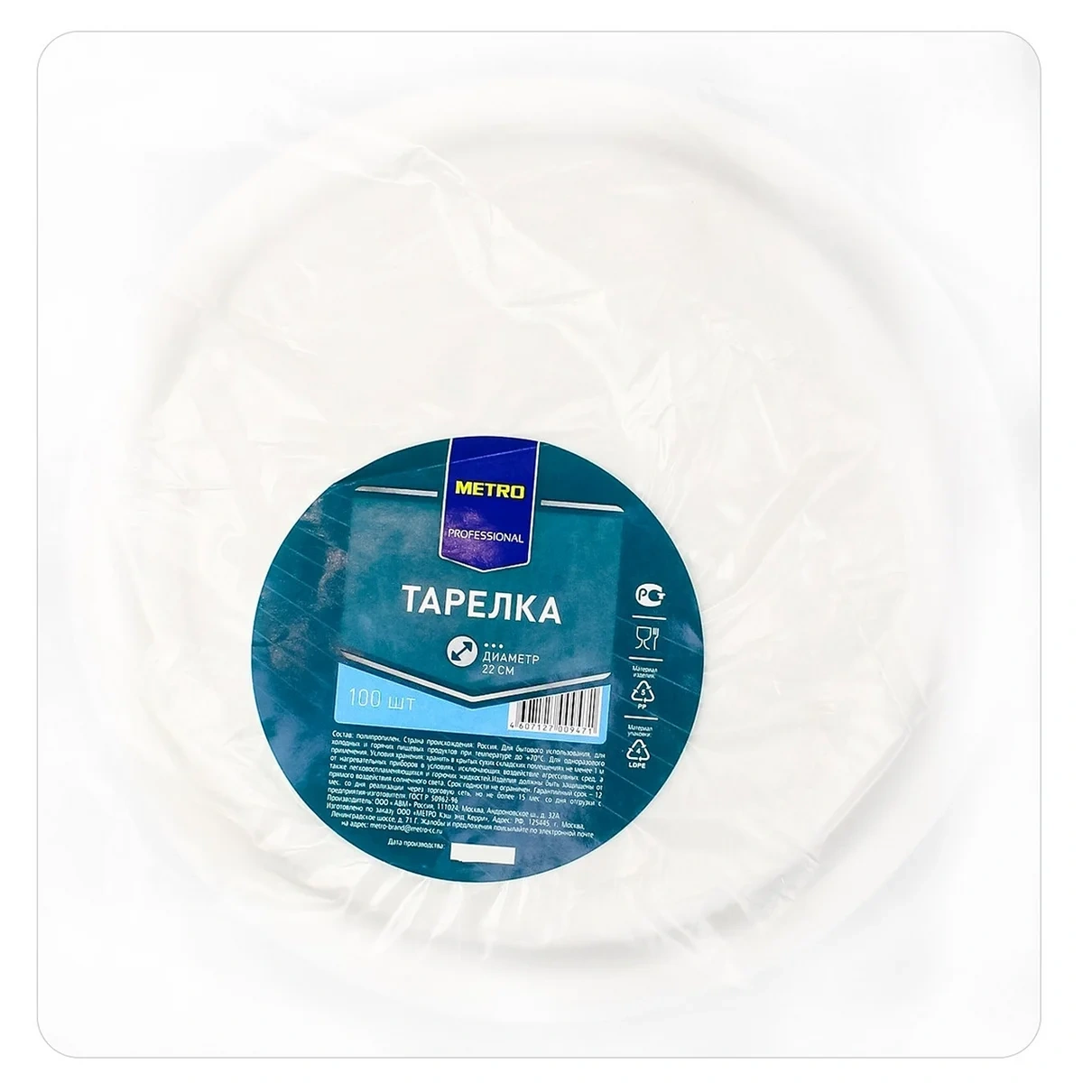 METRO PROFESSIONAL Тарелка пластиковая круглая, 220 мм, 100 шт. – незаменимое решение для пикников и неофициальных фуршетов. Одноразовая посуда выполнена из качественного пластика, безопасного для здоровья человека. Тарелки достаточно плотные, не гнутся под весом. За счет большого диаметра они одинаково хорошо подходят для вторых блюд, для салатов, овощных и фруктовых нарезок, бутербродов и канапе. А благодаря универсальному цвету впишутся в любую обстановку. В упаковке – 100 тарелок. Одной пачки вполне хватит, чтобы накрыть стол на целую компанию.