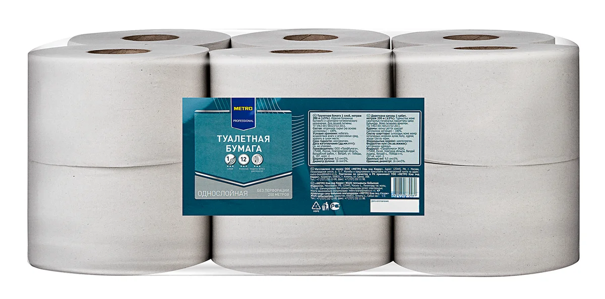 METRO PROFESSIONAL Туалетная бумага белого цвета с перфорацией состоит из одного слоя и имеет общую длину рулона 200 м. В упаковке двенадцать рулонов с тиснением и втулками. Туалетная бумага закрепляется на диспенсере. В составе изделия вторичная целлюлоза.