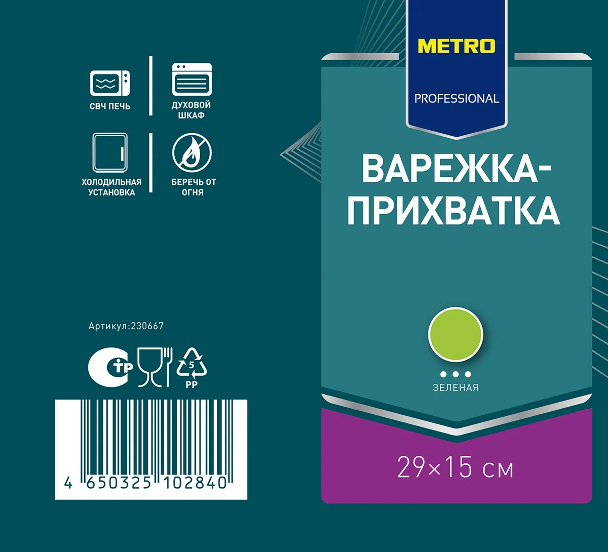Варежка-прихватка METRO PROFESSIONAL, силиконовая, зеленая предназначена для духовки и барбекю. Благодаря низкой теплопроводности силикона она надежно защищает руки от воздействия повышенных температур. Поверхность изделия оформлена противоскользящим рисунком, поэтому горячая кастрюля, противень, сковорода не выпадут из рук. Варежка способна эластично сгибаться. С ее помощью удобно захватывать разные поверхности. Внутренняя подкладка выполнена из ткани со стеганой текстурой, а сам материал приятен на ощупь. Прихватка отличается хорошей водонепроницаемостью, полностью защищает кисти и запястья от пара и брызг. Изделие легко надевать, а при работе в варежке ни одно движение не сковывается. Мягкий приятный силикон не имеет запаха, не вы??ывает аллергических реакций и раздражений на коже. Модель оснащена специальной петлей для подвешивания, поэтому ее удобно хранить. Она всегда остается в поле зрения во время приготовления блюд. Изделие поддается многократным стиркам. За счет своей прочности оно надолго сохраняет первоначальную форму и цвет даже при интенсивной эксплуатации.