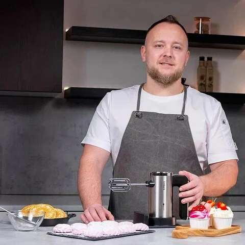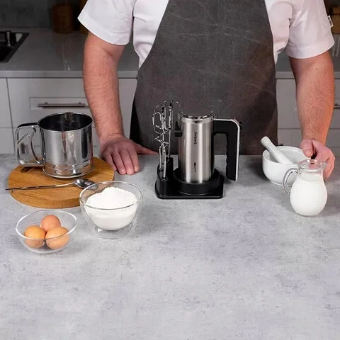 В комплекте предусмотрены 2 крюка для замешивания теста и 2 венчика для взбивания яиц и крема, а также смешивания жидкостей.