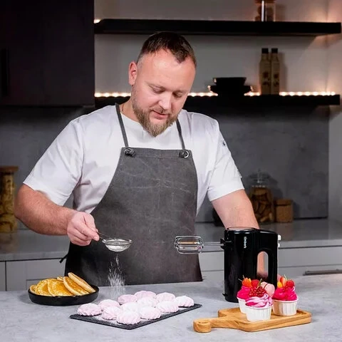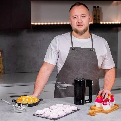 В комплекте предусмотрены 2 крюка для замешивания теста и 2 венчика для взбивания яиц и крема, а также смешивания жидкостей.