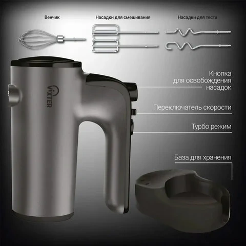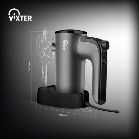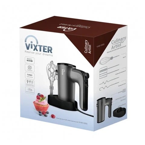 Миксер VIXTER VHM-3300 оснащен функциональной подставкой для всех трёх насадок, но не выглядит громоздким и не занимает много места. Благодаря лаконичному внешнему виду легко впишется в дизайн любой кухни.