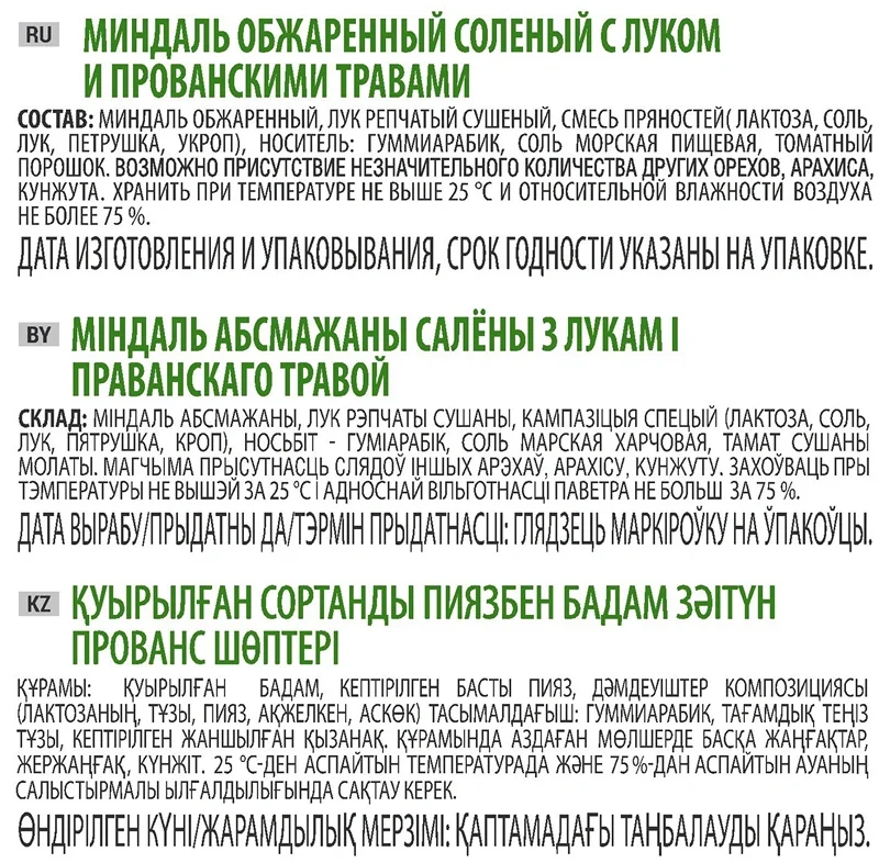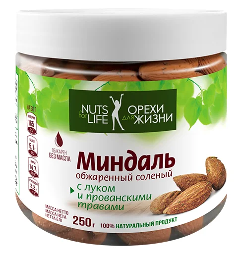 Ядра высококачественного обжаренного миндаля с потрясающим букетом прованских трав делают вкус этого натурального снека поистине изысканным и незабываемым. Миндаль помогает утолить голод, укрепить сосуды и сердце, а натуральные сушеные прованские травы и лук - сделать полезный перекус бесконечно приятным. Подходит для вегетарианцев и людей, ведущих здоровый образ жизни.