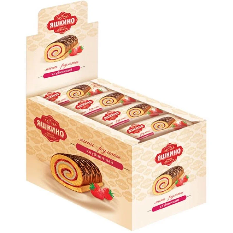 Мини-рулеты Яшкино Клубничные (12 штук по 35 г). Состав: мука пшеничная в/с, сахар, масла растительные, джем 'Клубника' (патока; пюре: яблочное, клубничное; стабилизаторы: пектин, цитрат кальция; краситель кармин), молоко цельное сгущенное с сахаром (молоко цельное, молоко обезжиренное, сахар (сахароза), лактоза), продукты яичные сухие: меланж, какао-порошок, сыворотка молочная сухая, крахмал кукурузный, яйцо куриное, спирт этиловый ректификованный из пищевого сырья, влагоудерживающий агент: глицерин, разрыхлители (гидрокарбонат аммония, Е450 (i), гидрокарбонат натрия), эмульгаторы (сорбитан тристеарат, лецитин соевый, Е471), соль, регулятор кислотности (кислота лимонная, цитрат натрия), ароматизаторы, антиокислители (изоаскорбат натрия, Е306), консерванты: сорбат калия, бензоат натрия). Пищевая ценность на 100 г: белки - 5 г, жиры - 16 углеводы - 59 г. Энергетическая ценность на 100 г: 390 ккал. Хранить при температуре (18+3)С и относительной влажности воздуха не более 75%. Срок хранения: 6 месяцев. Вес: 420 г. Страна производства: Россия.