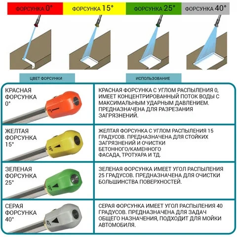 Красная форсунка: струя воды под углом 0° с максимальным напором воды, предназначена для удаления самых сложных загрязнений и для работы в труднодоступных местах.