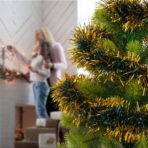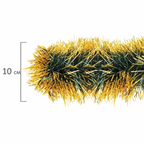 Длина мишуры в расправленном виде составляет 2 м, диаметр – 10 см. Материал мишуры – полиэтилентерефталат. В комплекте – 5 штук зелёной мишуры с золотистыми кончиками. Упакованы в пакет с зиплоком.