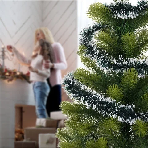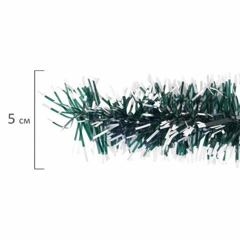 Длина мишуры в расправленном виде составляет 2 м, диаметр – 5 см. Материал мишуры – полиэтилентерефталат. В комплекте – 5 штук зелёной мишуры с белыми кончиками. Упакованы в пакет с зиплоком.