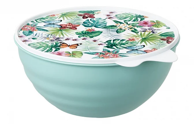 Миска с крышкой Phobo Wave в ассортименте, 2,8 л — практичное решение для сервировки стола и хранения продуктов. Посуда выполнена из экологически безопасного пластика, не содержащего бисфенол. Стенки миски имеют ребристую форму, предупреждающую скольжение в руках. Крышка закрывается герметично, оберегая содержимое от заветривания, контакта с посторонними запахами и воздействиями окружающей среды. В такой посуде можно подать блюда на пикнике или дачном застолье, не переживая о первозданном вкусе и внешнем виде содержимого. Для упрощения закрывания и открывания крышки она оснащена большой ручкой на боковой поверхности. Не менее удобна посуда для хранения: остатки пищи можно не перекладывать в контейнер, а поместить в холодильник сразу, что избавляет от необходимости дополнительного мытья. Цветовое решение представлено в нескольких вариантах, отличающихся не только базовой гаммой, но и рисунками на крышке, что позволяет подобрать дизайн по своему вкусу. Принты наносятся по особой технологии и сохраняют яркость даже при продолжительном использовании.