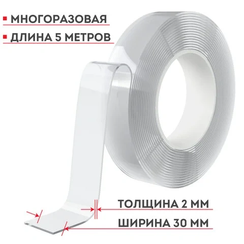 Многоразовая двухсторонняя прозрачная крепежная лента 'Скотч NANO tape 5 м х 30 мм', 2 мм, DASWERK,