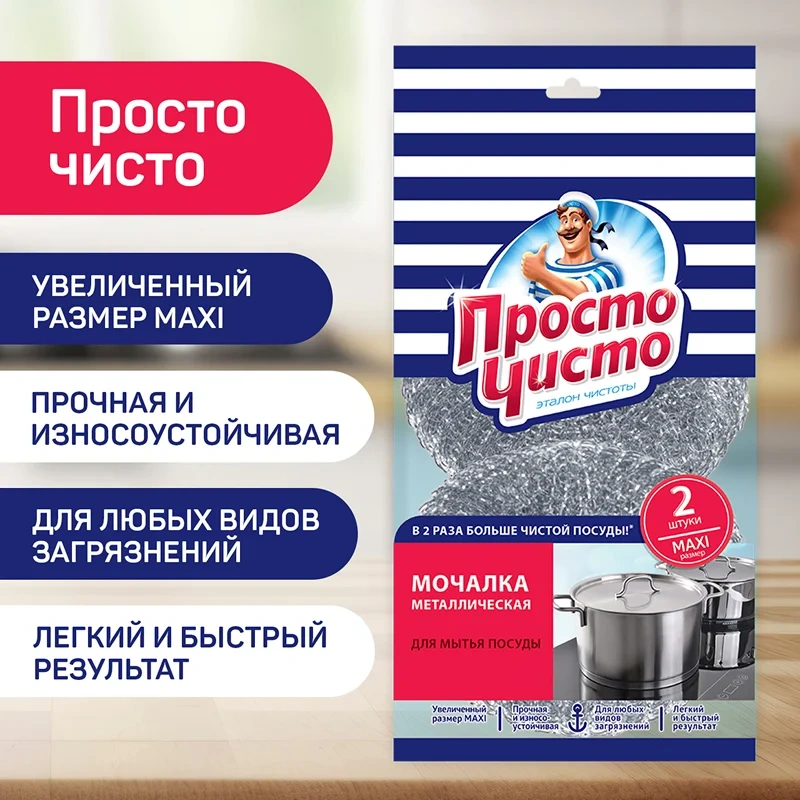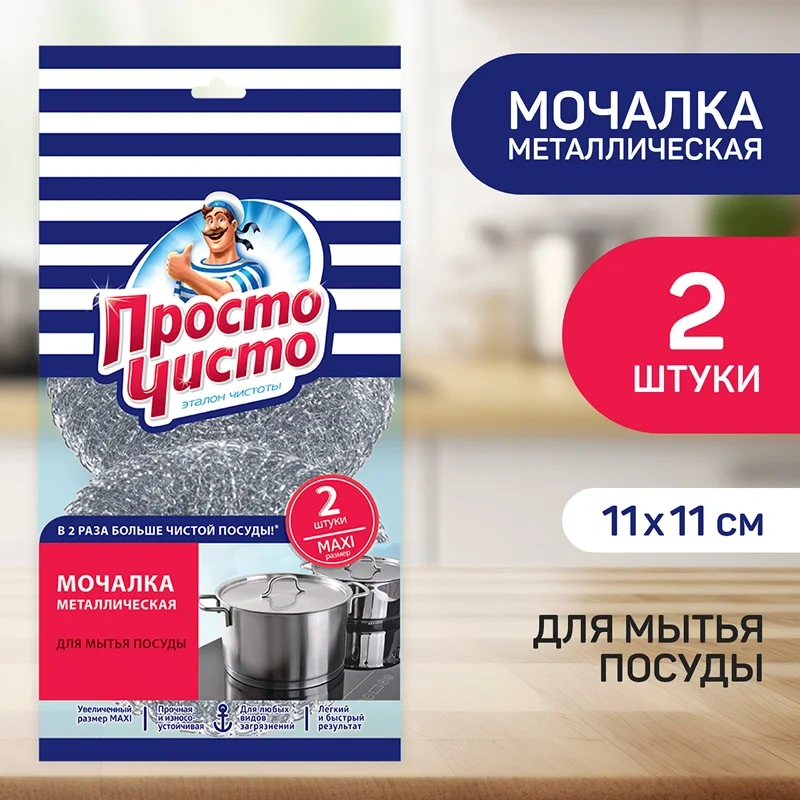 Мочалка Просто чисто Maxi для посуды металлическая, 2 шт. предназначена для самых разных поверхностей. С ее помощью можно быстро очистить посуду от загрязнений, остатков пригоревшей пищи, сложных жирных и засохших пятен (сковороды, кастрюли, противни, подносы и подставки для микроволновой печи, гриль). Материал, из которого изготовлена, позволяет быстро и качественно удалять любую грязь без усилий. Производитель использует при изготовлении своих товаров современные технологии и высококачественные материалы. Благодаря этому продукция отвечает главным требованиям: она удобна в эксплуатации, долговечна, безопасна и способна эффективно выполнять свои функции.
