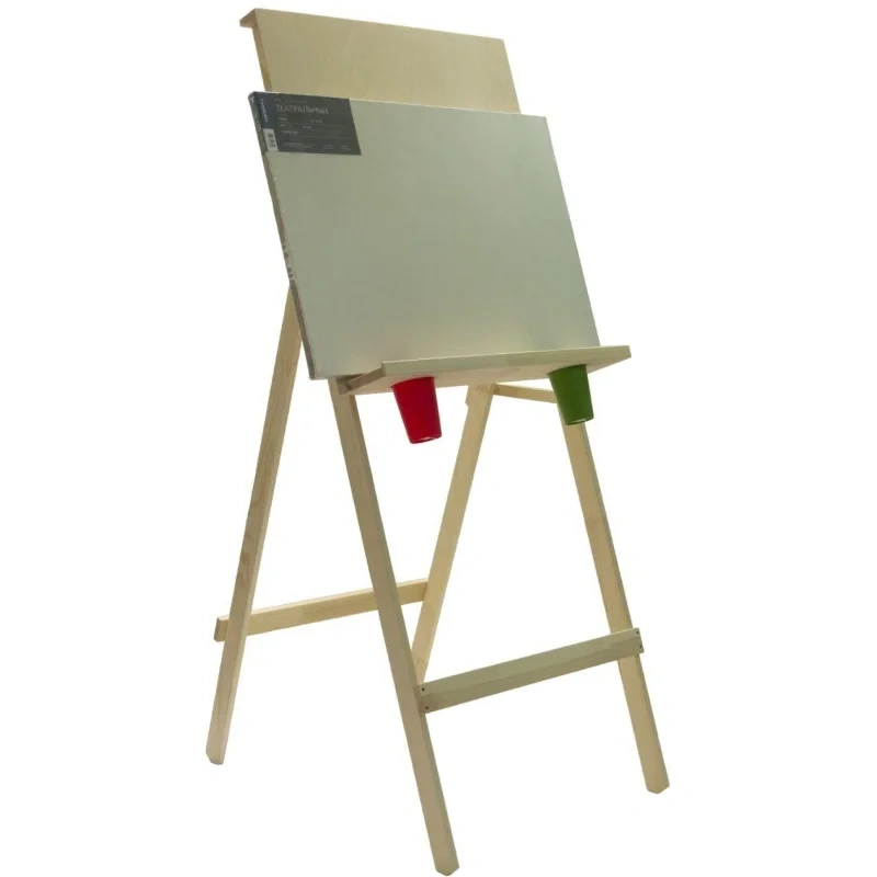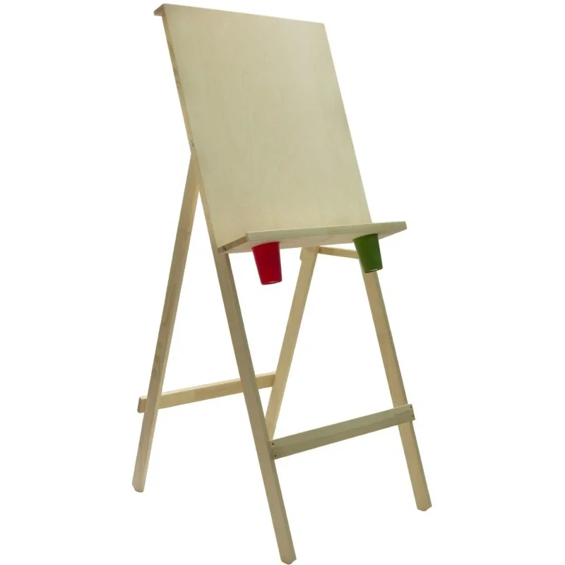 Мольберт-хлопушка — ученический мольберт идеально подойдет для занятий по рисунку или живописи. Оснащен широкой полкой со стаканчиками для удобства работы и хранения рабочих инструментов. Размер рабочей поверхности 600?700 мм, ширина полки 120 мм. Высота холста — 70 см. Общая высота мольберта — 135см.
