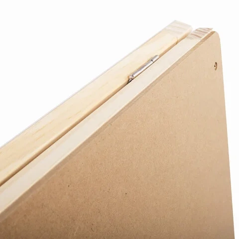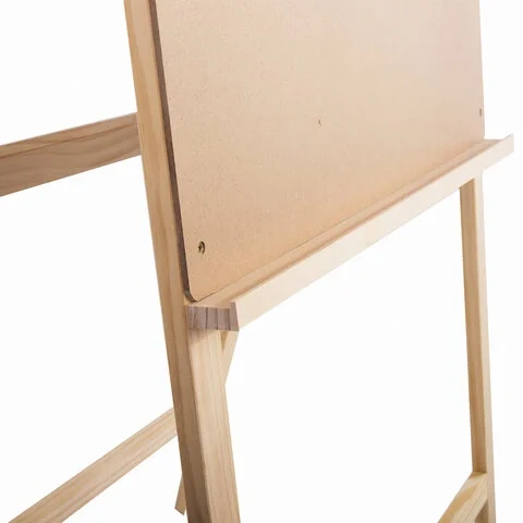Изготовлен из натурального дерева, рабочая поверхность представляет собой лист МДФ, к которому крепится бумага. Мольберт 'Хлопушка' прост в установке, в сложенном виде становится плоским и занимает относительно мало места в помещении. Конструкция мольберта достаточно устойчивая, предполагает напольное размещение и возможность работать сидя на стуле. Полка предназначена для размещения холстов на картоне или подрамнике, а также для хранения карандашей, кистей. Максимальная высота размещаемого холста – 60 см. Угол наклона мачты фиксированный.