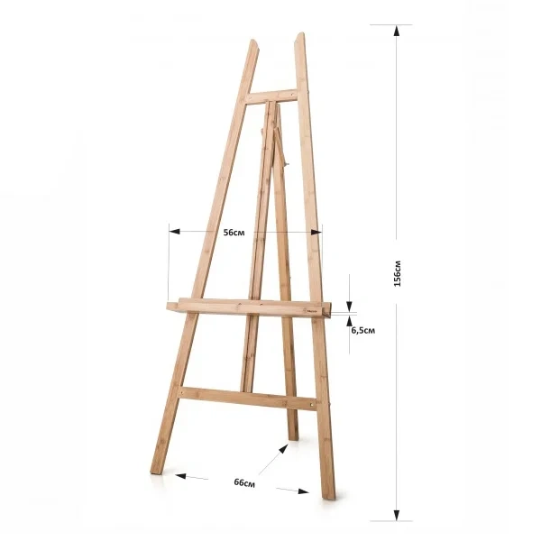 Выполненный из прочного и легкого природного материала бамбука, этот мольберт является поистине универсальной моделью. Благодаря отсутствию срединной штанги, он прекрасно подходит не только для работы в студии, но и для последующей демонстрации картин в выставочном зале, тем более, что его увеличенная полка позволяет устанавливать на нее 3D-холсты, а также картины, оформленные в широкий багет.