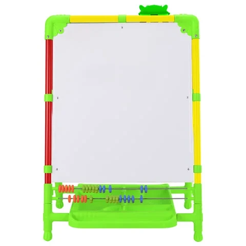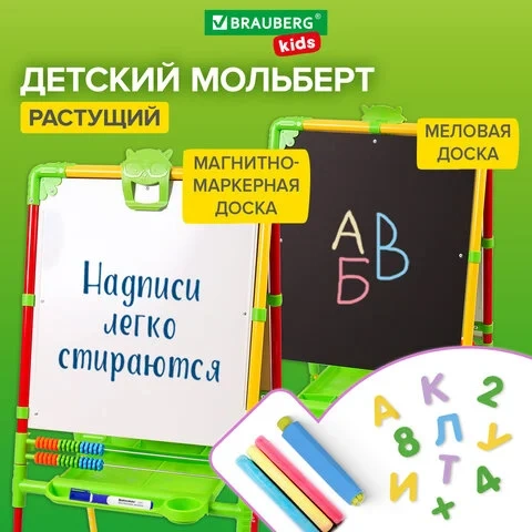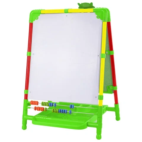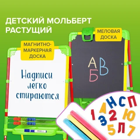 Поверхность мольберта белого цвета предназначена для рисования специальным маркером для белой доски, а также для размещения магнитов; черная поверхность - для рисования мелками. Для детей старше 3-х лет. Регулируется по высоте от 73,5 до 107,5 см для удобства использования детьми разного возраста и роста. Размер рабочей поверхности: 53х46 см. Цвет: светофор.