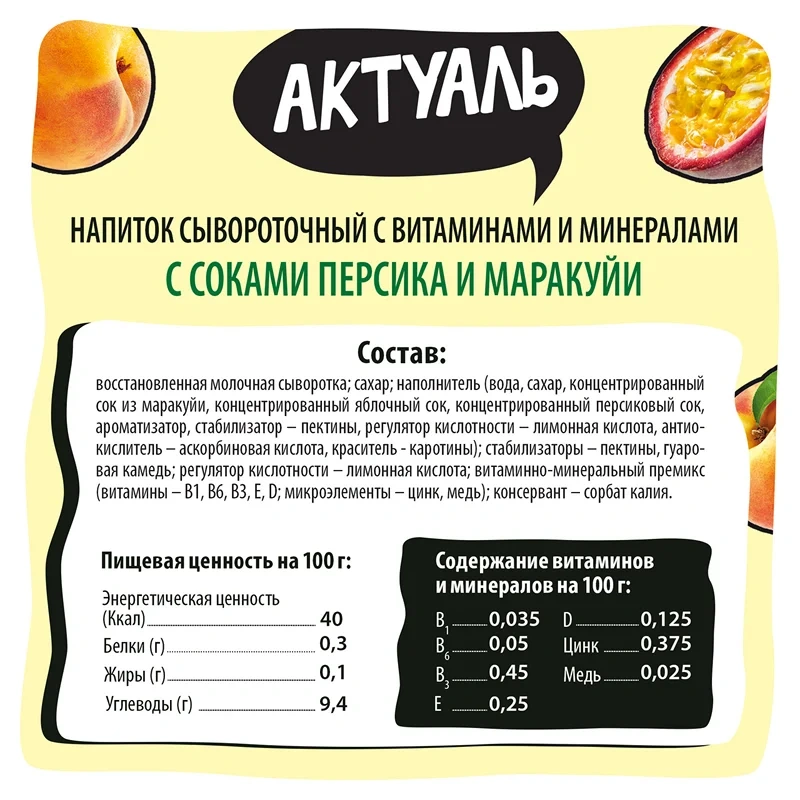 Молочносоковый напиток Актуаль на сыворотке персик-маракуйя, 930г
