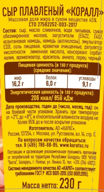 Сыр плавленый Карат Коралл 45%, 230г