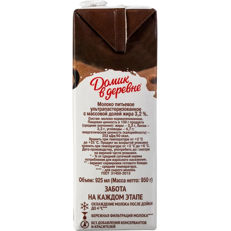 Молоко Домик В Деревне 3.2%, 950г, ультрапастеризованное, для капучино