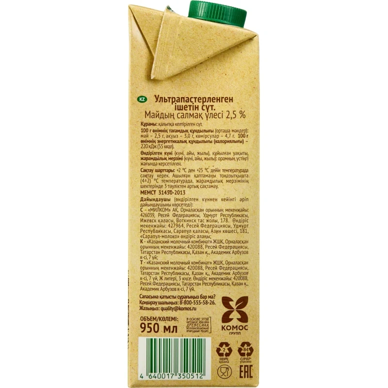 Молоко Село Зелёное 2.5%, 950мл, ультрапстеризованное