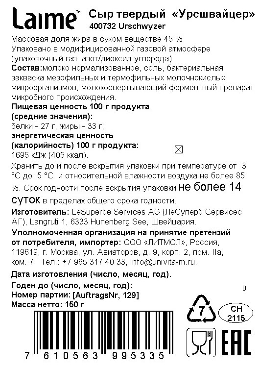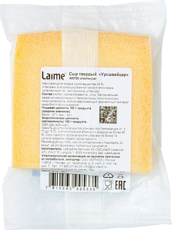 Сыр Laime Урсшвайцер кусок 45%, 150г