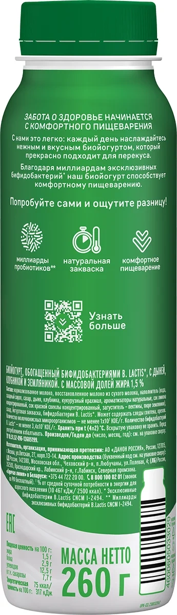 Йогурт питьевой Актибио дыня-клубника-земляника 1.5%, 260г