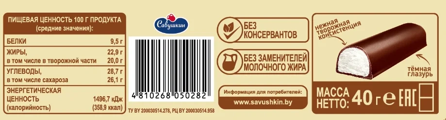 Сырок творожный глазированный Творобушки ваниль в темной глазури 20%, 40г