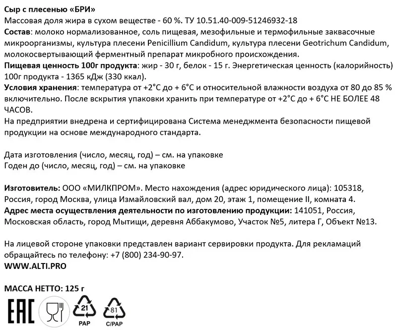Сыр Alti Brie мягкий 60%, 125г