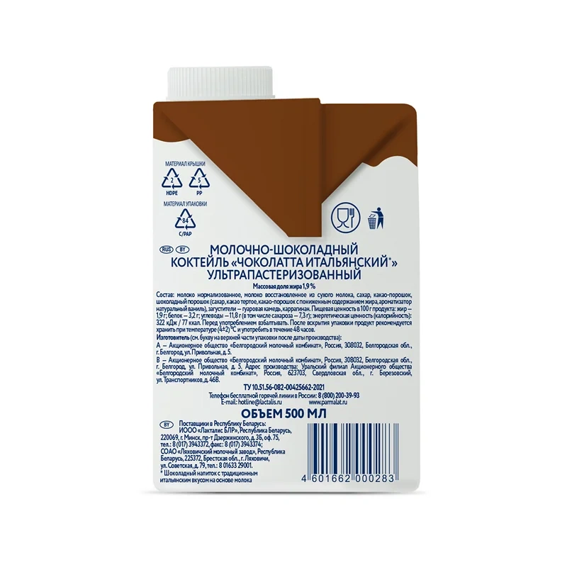 Коктейль молочный Parmalat Чоколатта итальяно, 500 мл БЗМЖ (без заменителя молочных жиров) – это напиток с приятным вкусом и невысоким процентом жирности от итальянского производителя. Он приготовлен из нормализованного молока с добавлением не только какао-порошка, но и изысканного шоколада. Именно поэтому напиток известной итальянской марки имеет такой насыщенный шоколадный цвет, вкус и аромат. В 100 г продукта содержится 80 ккал и 3 г белка. Благодаря этому он подходит для тех, кто внимательно следит за своей фигурой. Коктейль поможет приглушить чувство голода или станет аппетитным дополнением к завтраку.