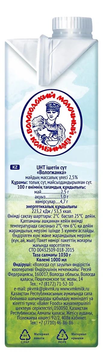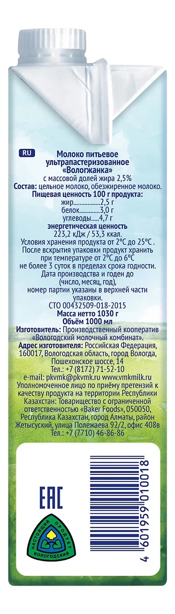Состав: молоко нормализованное. Энергетическая ценность на 100 г: жиры 2,5 г, белки 3,0 г, углеводы 4,7 г. Общая энергетическая ценность: 53 ккал.