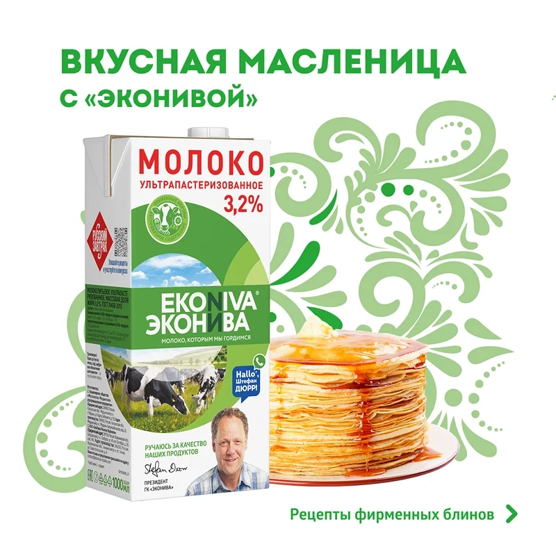 Молоко Эконива ультрапастеризованное 3.2%, 1л