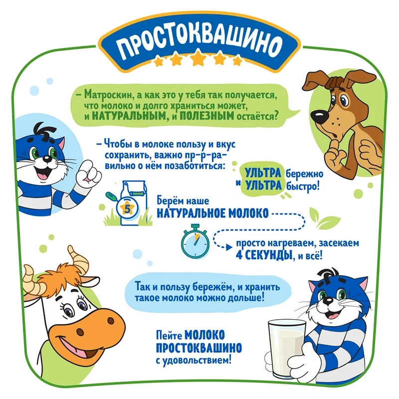 Молоко «Простоквашино» удобно использовать для приготовления чая, кофе, какао, а также для подачи с хлебобулочными изделиями или сладостями. Оно подходит для офисного и домашнего потребления.