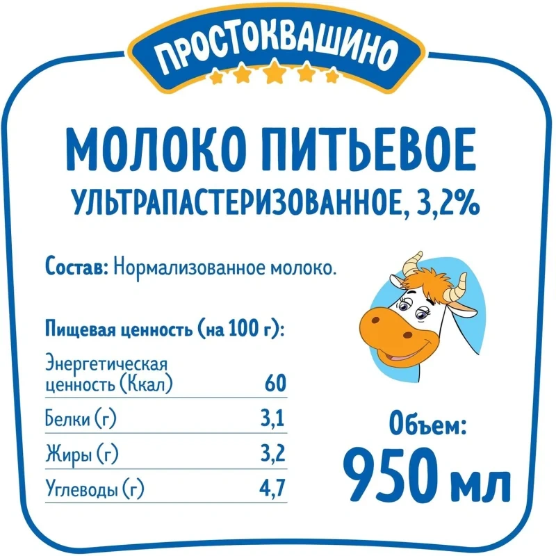 Молоко Простоквашино 3.2%, 950мл, ультрапастеризованное