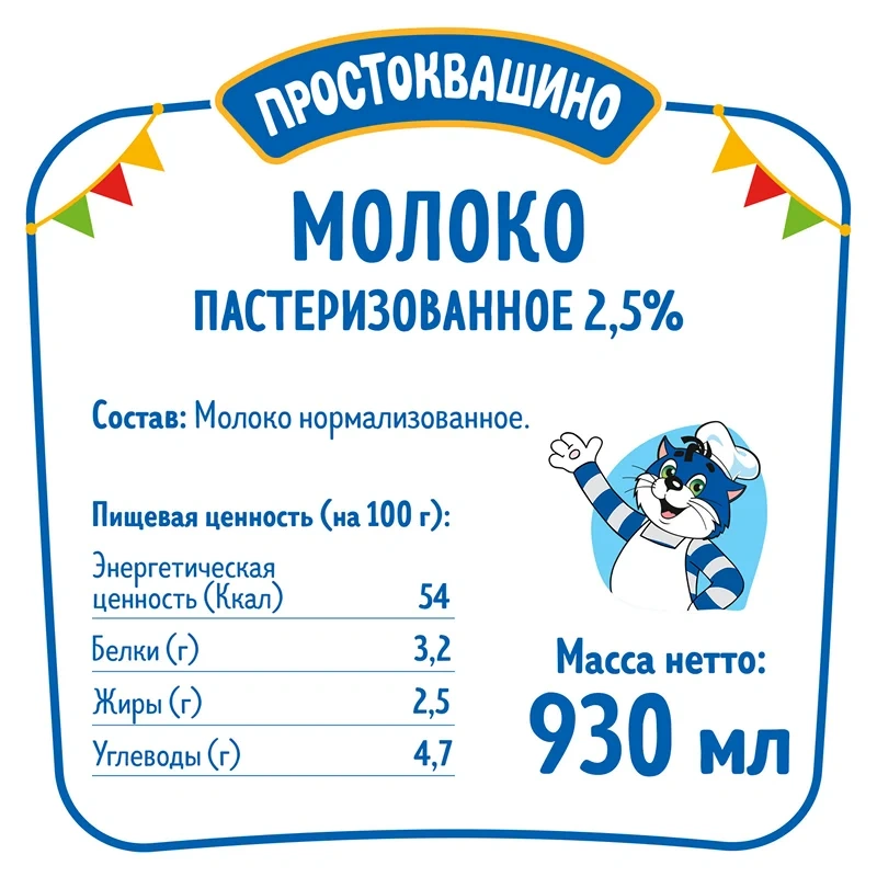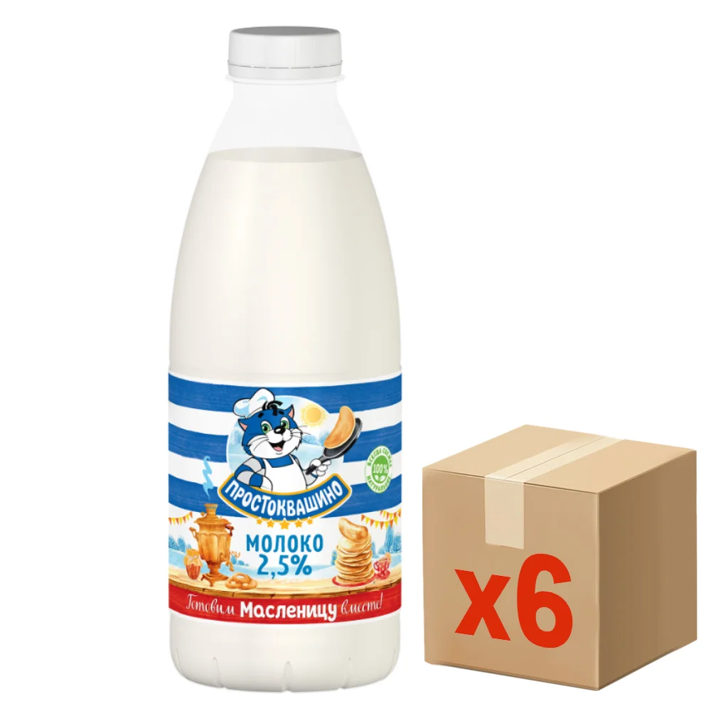 Молоко Простоквашино пастеризованное 2.5%, 930мл x 6 шт