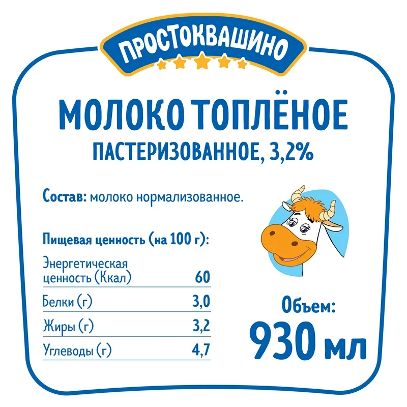 Молоко Простоквашино топленое пастеризованное 3.2%, 930мл