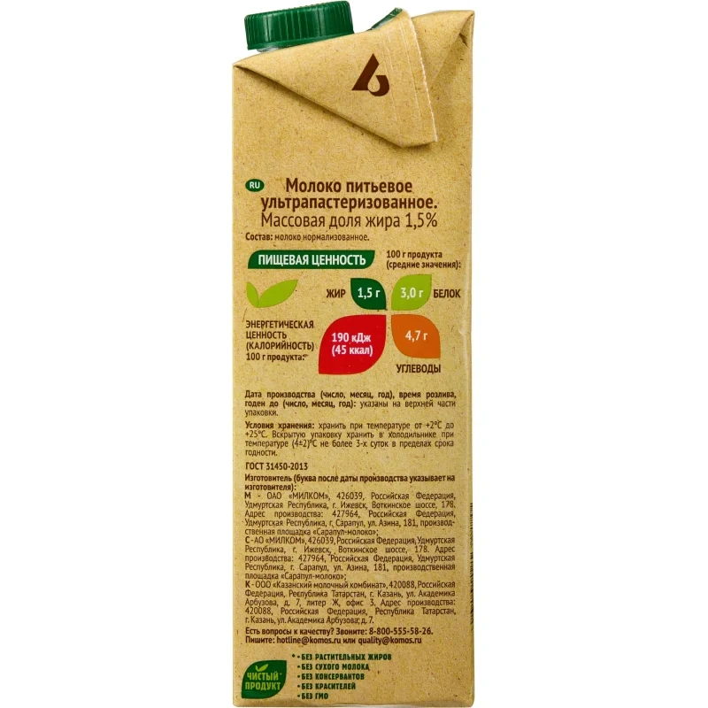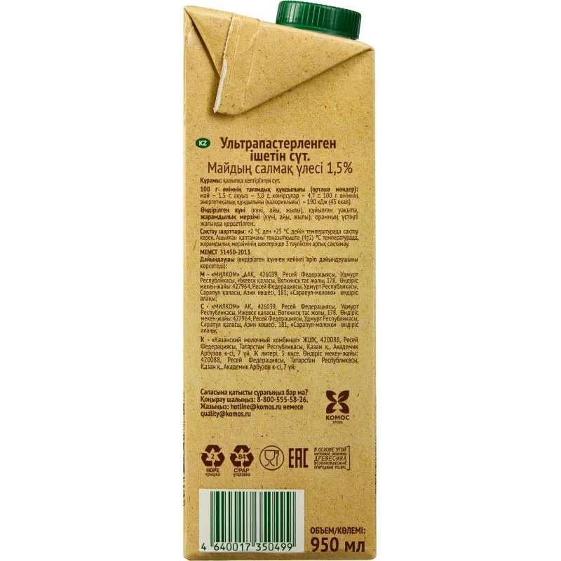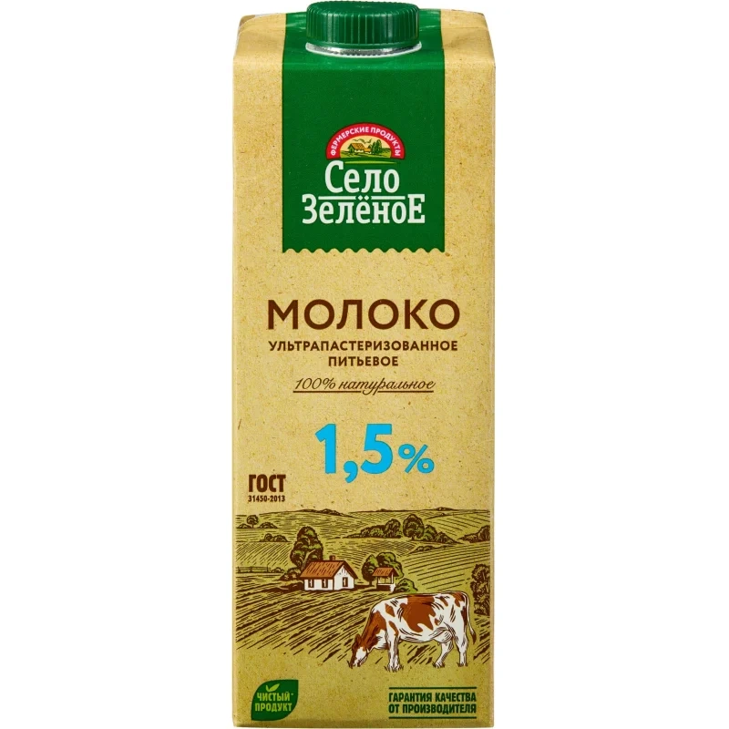 Молоко Село Зелёное 1,5%, 950мл, ультрапстеризованное