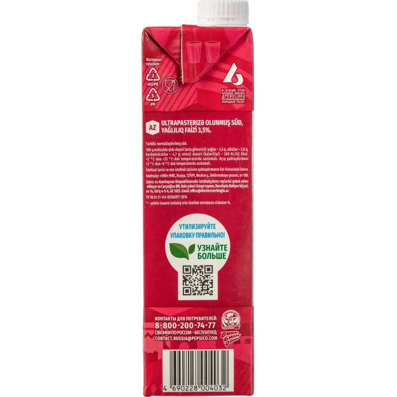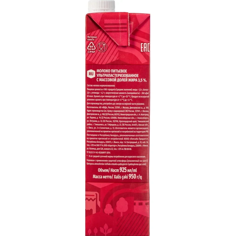 Молоко Село Зелёное 3.2%, 950мл, ультрапстеризованное